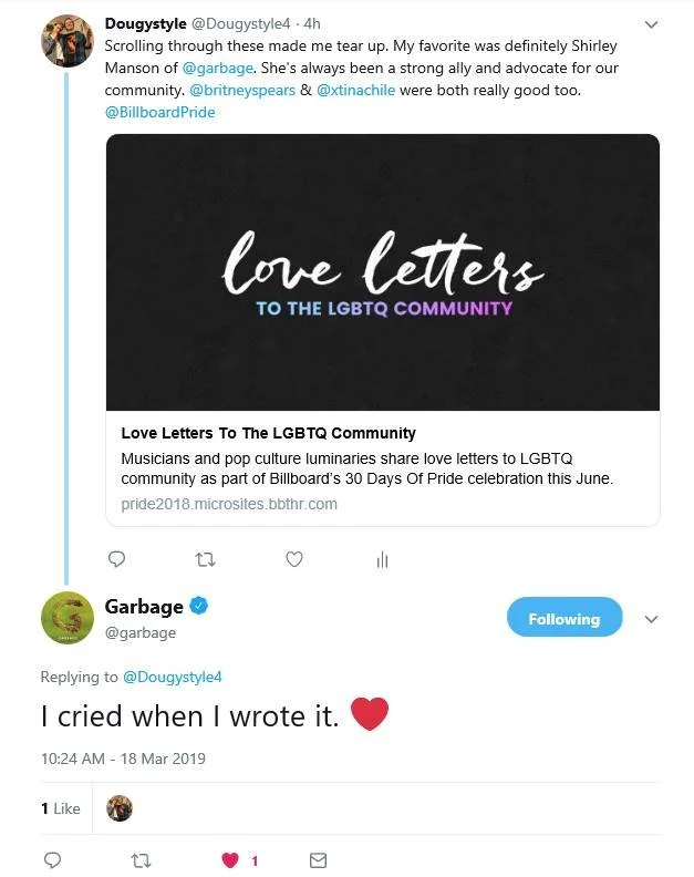 At both shows Shirley Manson made a point to talk about the band's queer fans, dedicating a song to them each time and telling them that they have their full support (for my shows they dedicated Cherry Lips and Sex is Not the Enemy to the queer fans). Shirley says the band's queer fans are very important to her and she also makes sure to acknowledge them and give them a safe space to express themselves. My friends who have also seen Garbage live, which include Brandon and Liz, also confirmed that Shirley talked about the band's queer fans at their shows too and dedicated a song to them as well. A few years later I read a very touching open letter Shirley wrote for Billboard Pride for the queer community where she acknowledged the pain and violence this community has had to endure while also saying that their ability to still shine and live their best lives as best they can is a testament to the strength and beauty of this community. I remember tweeting about it and Shirley responded immediately saying she was crying when she wrote that! As if I couldn't love her even more! Stone Temple Pilots may be my favorite band to come out of Grunge and 90s Alternative, but Shirley Manson is my favorite person to come out of that era. To me she is a pillar of strength and resilience who speaks her mind and isn't afraid to rattle some cages.